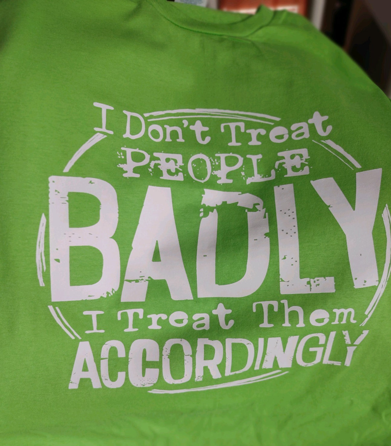 Add some wit to your wardrobe with our playful and vibrant Treat Them Accordingly shirt. Made with 100% cotton, this bright green shirt is sure to stand out.